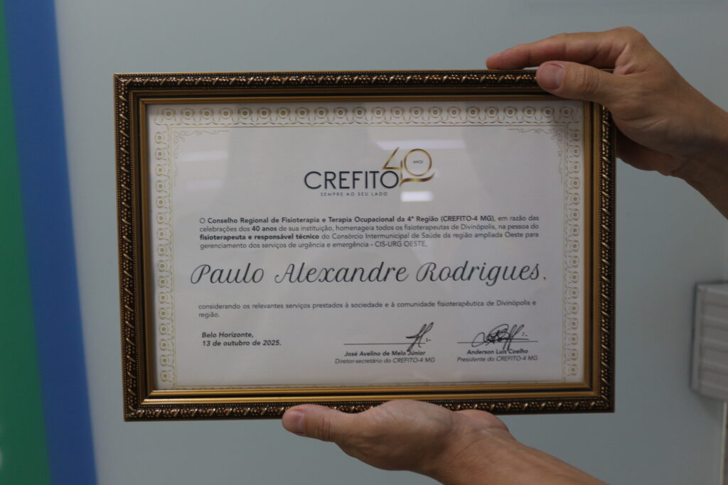 O fisioterapeuta e responsável técnico do setor, da UPA Divinópolis, Paulo Alexandre Rodrigues, foi homenageado pelo Conselho Regional de Fisioterapia e Terapia Ocupacional da 4ª Região (CREFITO-4/MG) pelos relevantes serviços prestados à sociedade e à comunidade fisioterapêutica de Divinópolis e região.
